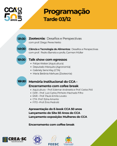 Dia 3 de dezembro – Evento “CCA 50 anos: Formação, Inovação, Sustentabilidade e Cenários Futuros”