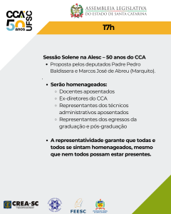 O evento ocorrerá das 8h às 19h. Pela manhã, serão realizadas homenagens às instituições que apoiaram e apoiam o CCA ao longo desses 50 anos, além de painéis temáticos. No período da tarde, a programação seguirá com debates e, a partir das 17h, será realizada a Sessão Solene proposta pela Assembleia Legislativa do Estado de Santa Catarina (Alesc), por iniciativa do Deputado Padre Pedro Baldissera e do deputado Marco José de Abreu (Marquito), em reconhecimento à relevância histórica e contemporânea do CCA para o desenvolvimento científico, tecnológico e social de Santa Catarina. Na Sessão Solene, serão homenageados docentes e servidores que contribuíram significativamente para a construção e consolidação do Centro.